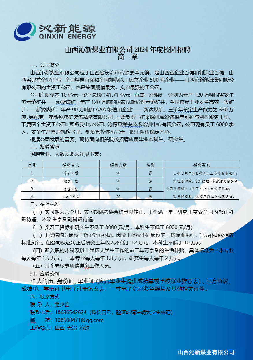 山西沁新煤业有限公司2024年度校园招聘