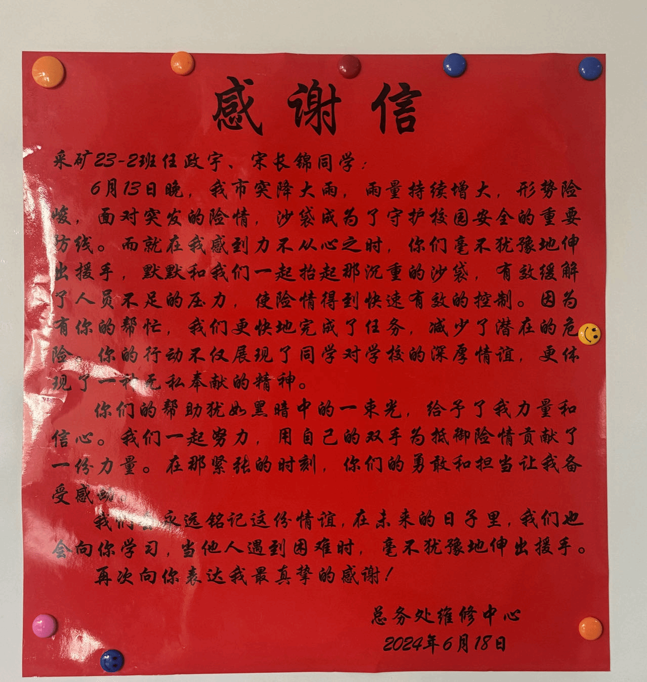 6月13日晚,我市突降大雨,雨量持续增大,校园防洪形势严峻,线上电玩城官网 采矿23-2班任政宇、宋长锦两位同学不顾天气恶劣,冒着暴雨帮助总务处搬运防洪沙袋,倾尽全力为校园安全筑起防线。总务处为两位同学送来感谢信,电玩城 也对两位同学提出表扬,两位大一同学在险情面前表现出的是矿业学子的责任和担当,希望全体同学向任政宇、宋长锦两位同学学习。