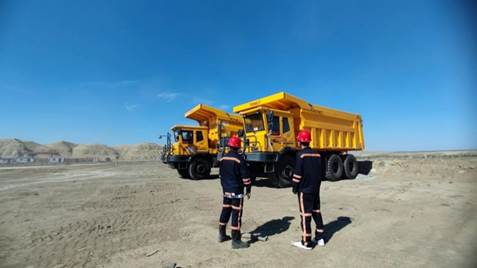 团队成员在矿山自卸卡车运输现场学习