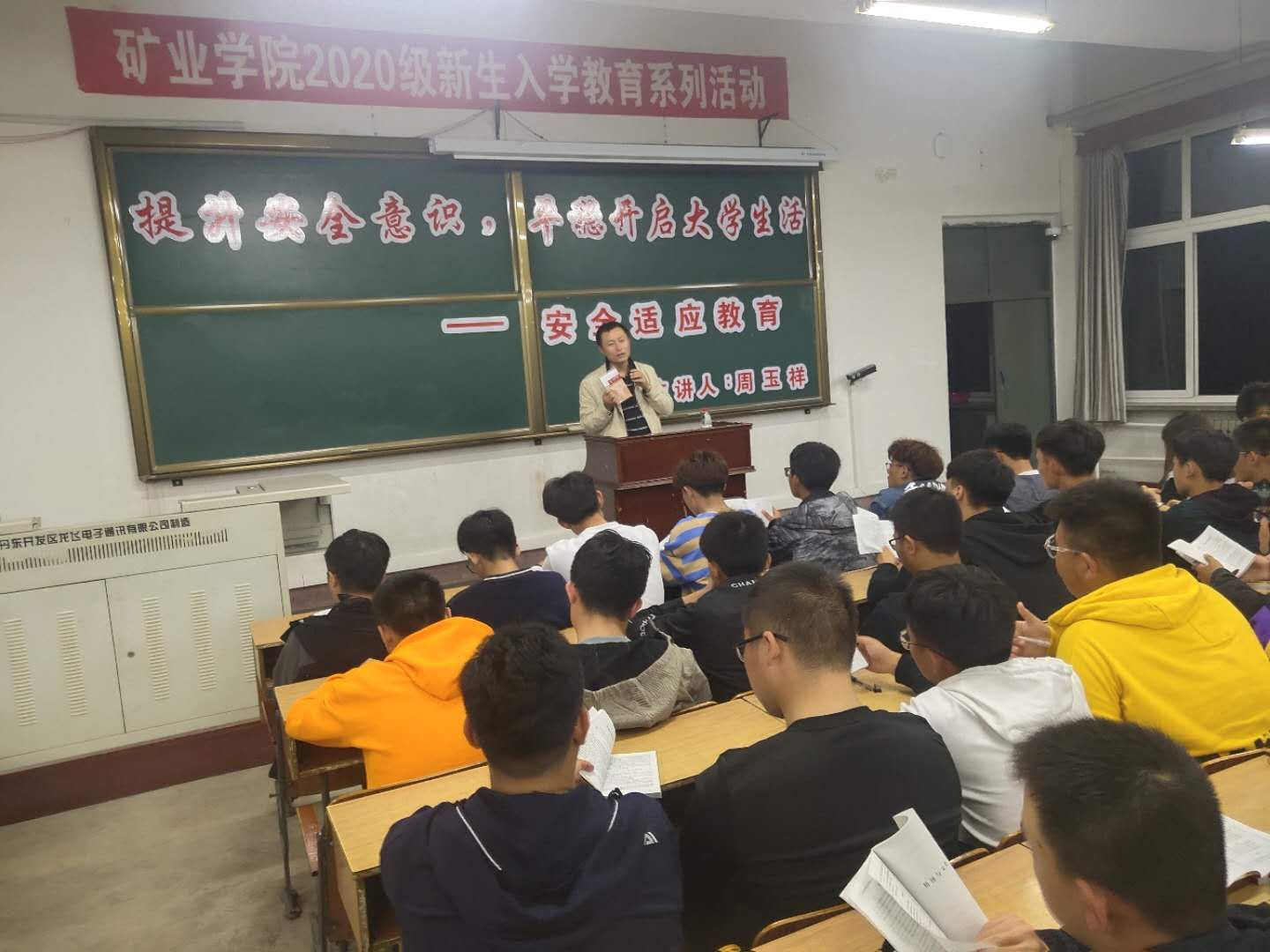 首先周玉祥老师就人身安全问题进行阐述,告诉同学们要拒绝打架斗殴、酒后闹事,提醒同学们在寝室中不要使用违章电器,保证自己及大家的安全。对于刚上大学的同学所面临各种压力,包括学习,生活,社交,经济等等,周玉祥老师就这些问题详细介绍了压力的缓解方式,并指出锻炼是最好解压的方式,不仅发泄了情绪,还锻炼了身体。最后,周老师提醒同学们应该注意自己的财产安全,拒绝校园贷,避免进入传销组织。在安全问题之后,周玉祥老师为大家介绍了学生手册中有关考试违纪的判定以及处罚,并要求大家仔细阅读学生手册。