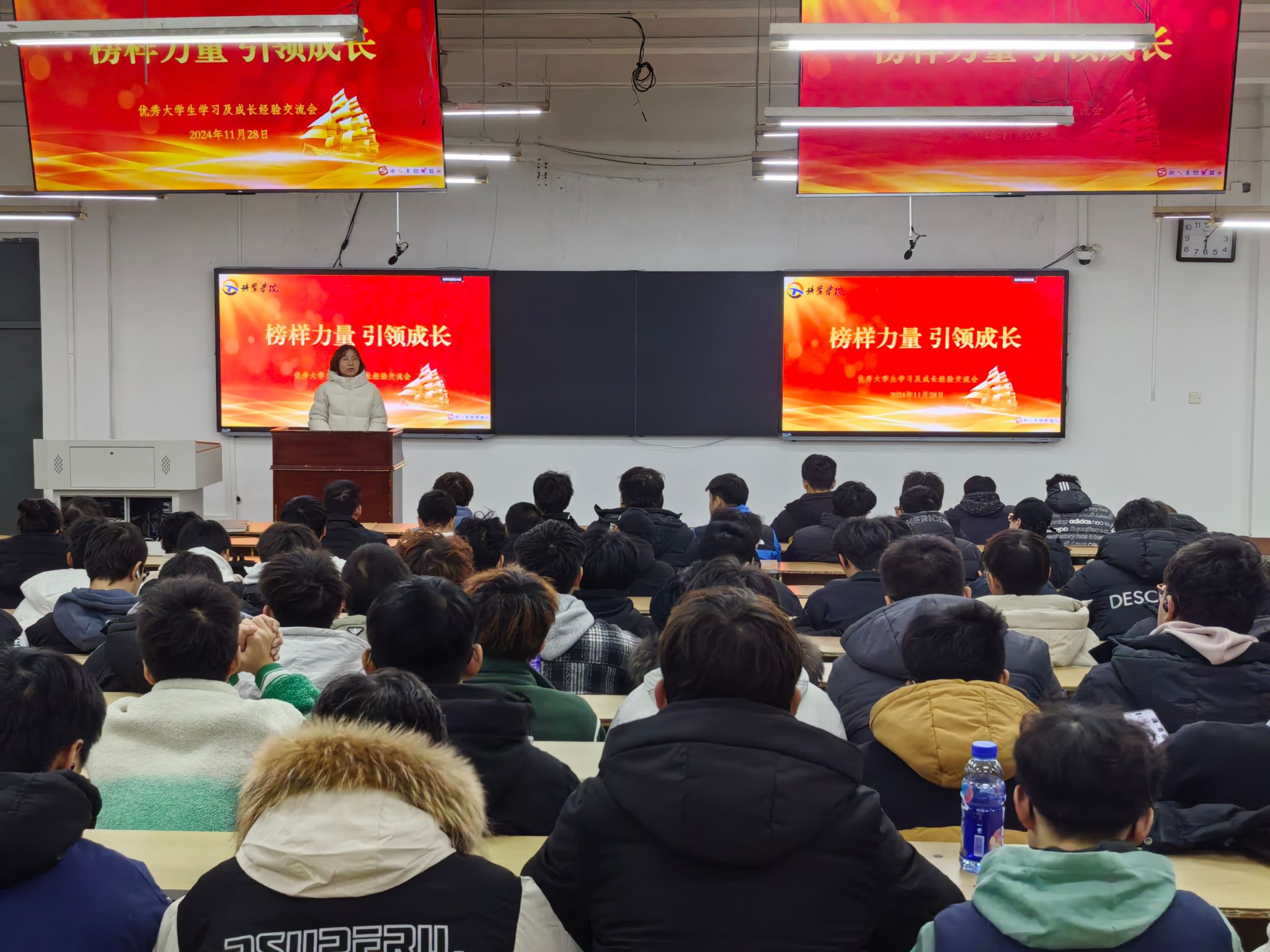 为了发挥榜样引领作用,引导和帮助同学们更好地进行学业规划,营造积极进取的学习氛围,促进电玩城 学风建设。11月28日晚线上电玩城官网 在新华楼404教室开展“榜样力量 引领成长”优秀大学生学习与成长经验分享会。本次分享会由学工部主任霍欣主持,国家奖学金获得者孔德瑞、张拓;“太阳石”奖学金获得者曲城逸;省政府奖学金获得者高浩杰,4名同学分别根据自己在大学期间取得的成绩和成长经历进行分享,线上电玩城官网 24级全体新生及23级学生代表参加了本次分享会。