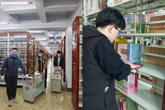 学生志愿者分组到图书馆各库房进行清洁书架、运输书籍、书籍倒架、移架等工作。图书馆的书籍门类众多,纷繁复杂。工作伊始,志愿者在图书馆老师的指导下认真学习工作细则,接受专业的培训后随即投入到工作当中。志愿者们分组协作,密切配合,以敬业专注的工作态度和饱满的精神状态在负责区域内做好志愿服务工作,为全校同学能在更加整洁明亮的图书馆中借阅书籍贡献自己的力量。